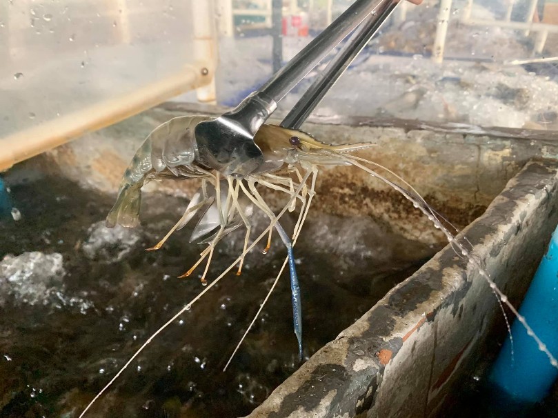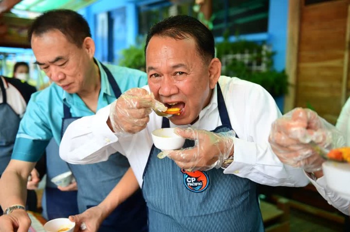 Director-General Meesak Pakdikong demonstrating the safety of seafood by cooking and eating shrimp.