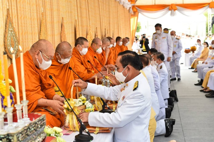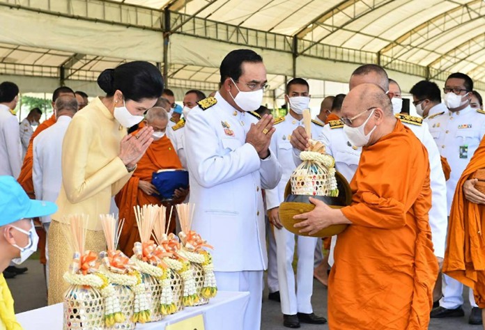 The Prime Minister Gen Prayut Chan-o-cha, accompanied by his wife Naraporn Chan-o-cha, presided over the alms giving ceremony celebrating the auspicious occasion of His Majesty the King’s birthday, at Sanam Luang in Bangkok this morning.