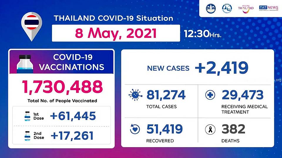 NewsThailandUpdate COVID-19 Thailand COVID-19 Situation as of 8 May, 2021 By Pattaya Mail May 8, 2021 0 1303 Share on Facebook Tweet on Twitter tweet