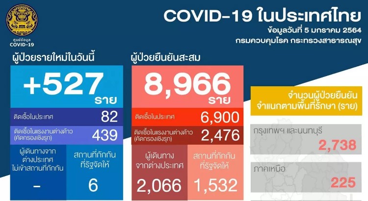Dr Taweesilp Visanuyothin, spokesman of the Center for COVID-19 Situation Administration, said the 527 newly confirmed cases included 82 local infection cases and 439 migrant workers who were detected through active testing.