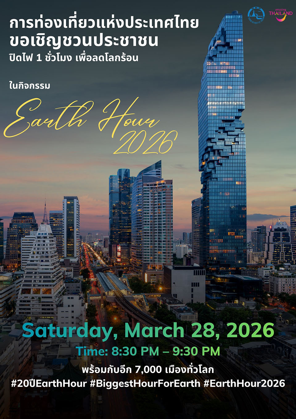 The Tourism Authority of Thailand invites the public to take part in Earth Hour 2026 on Saturday, March 28, from 8.30 PM to 9.30 PM, joining more than 7,000 cities worldwide in switching off non-essential lights to raise awareness on climate change and global warming.