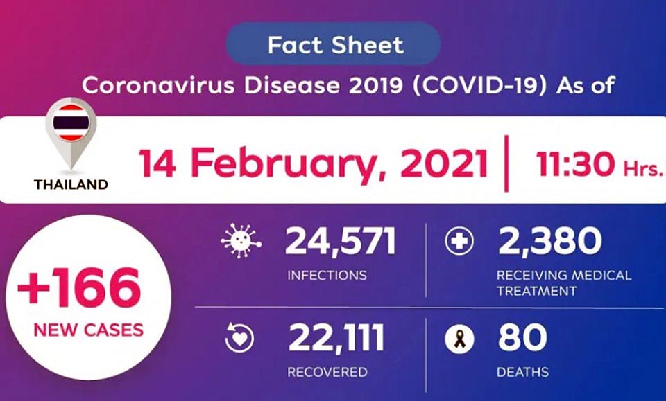 Health & WellbeingNewsThailandUpdate COVID-19 Thailand logs 166 new Coronavirus cases while 2,380 being treated in hospitals By Pattaya Mail February 14, 2021 0 1889 Share on Facebook Tweet on Twitter tweet Coronavirus Disease 2019 (COVID-19) situation in Thailand as of 14 February 2021, 11.30 Hrs. Stay safe.