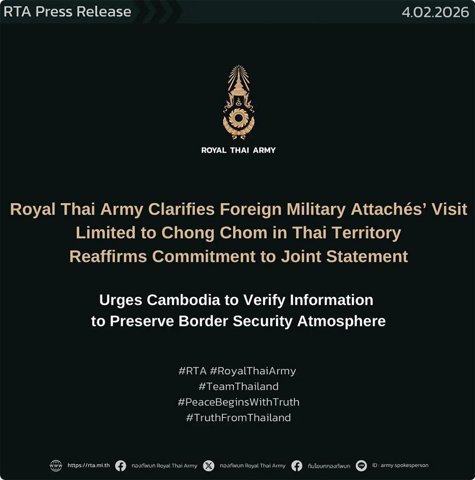 The Royal Thai Army reiterates its strict adherence to all provisions of the Joint Statement and urges Cambodia to thoroughly verify information before presenting it publicly, so as to avoid misleading the public or disseminating inaccurate claims. Such actions risk contravening Article 8 of the Joint Statement and unnecessarily escalating tensions at a time when the situation is stabilizing. (NNT)