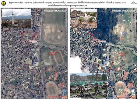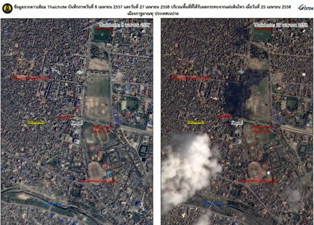 The images were captured on 27 April 2015 at 12.10 p.m. local time in Thailand, for comparison to those captured on 8 April 2015, nineteen days before the earthquake.