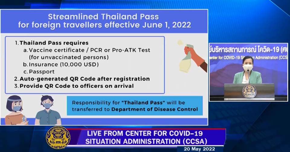 According to Maratee Nalita Andamo, Director of the News Division of the CCSA, Thailand Pass requires a vaccine certificate or a PCR or Pro-ATK Test result for unvaccinated persons, an insurance policy of 10,000 US dollars in coverage, and a passport. The system will automatically create a QR Code which will need to be presented to authorities upon entering the Kingdom. Furthermore, the responsibility for the Thailand Pass System will be transferred to the Department of Disease Control. Thai nationals will no longer need to register under this system. The changes will take effect from June 1st.