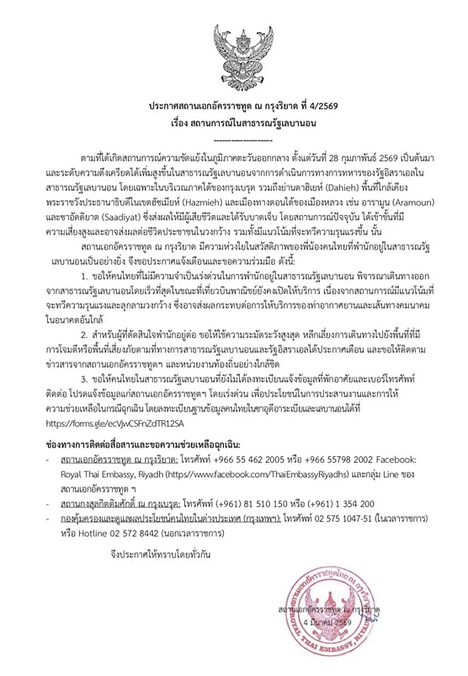 The embassy is asking Thai citizens in Lebanon who have not yet registered their contact details to submit their information through the Thai nationals database for Saudi Arabia and Lebanon at https://forms.gle/ecVjwCSFnZdTR12SA to help authorities coordinate assistance during emergencies.