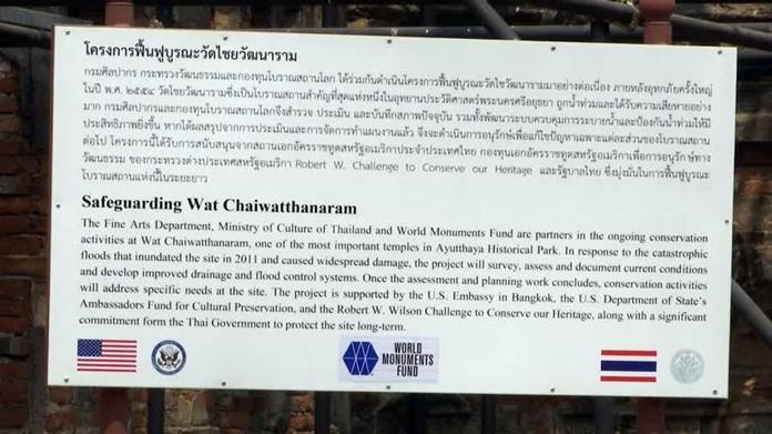 The US Ambassador to Thailand, Michael DeSombre, the Deputy Permanent Secretary for Culture, Yupha Taweewattanakitborvon, the Governor of Ayutthaya, Panu Yaemsri,and the Deputy Director-General of the Fine Arts Department, Arunsak Kingmanee, took part in a ceremony to launch the latest phase of the restoration work. They acknowledged the US contribution to the conservation effort, which started after the historic floods of 2011 and were made through the Ambassadors Fund for Cultural Preservation, worth 1,156,800 US dollars.The temple is entering its third phase of repairs.