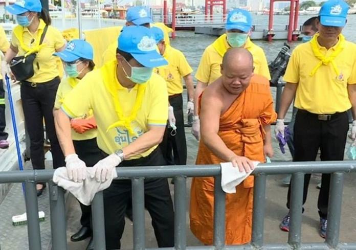 The measure began with the Temple of Dawn. Prime Minister’s Office Minister Tewan Liptapallop who supervises the National Office of Buddhism led officials and volunteers to clean the pagodas and crematorium of the temple. Officials also sprayed disinfectant in the compound.
