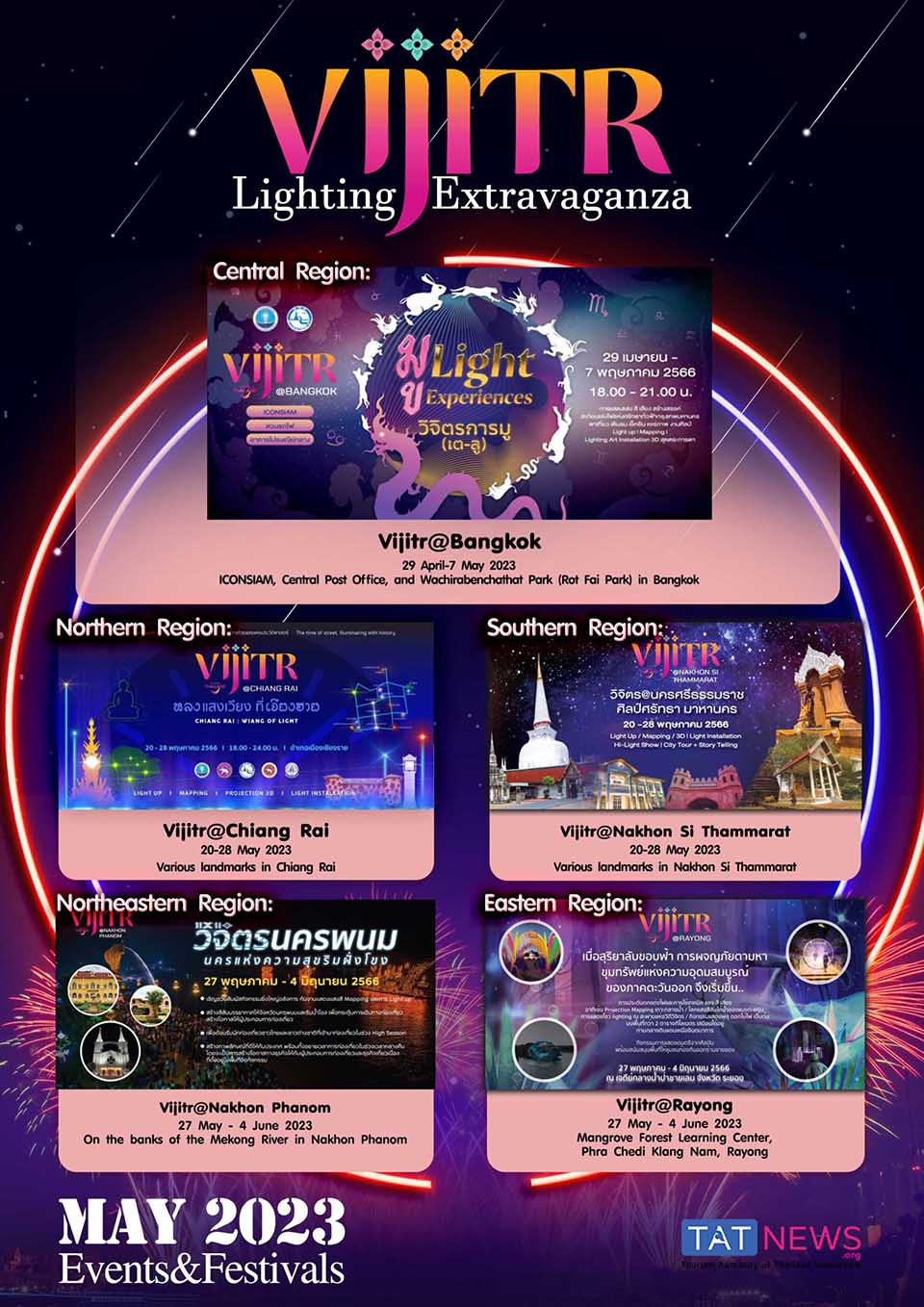 The Tourism Authority Thailand (TAT) has scheduled to stage the ‘Vijitr’ extravagant light-and-sound events in the five regions of Thailand – Central, Northeastern, Northern, Southern, and Eastern Regions.