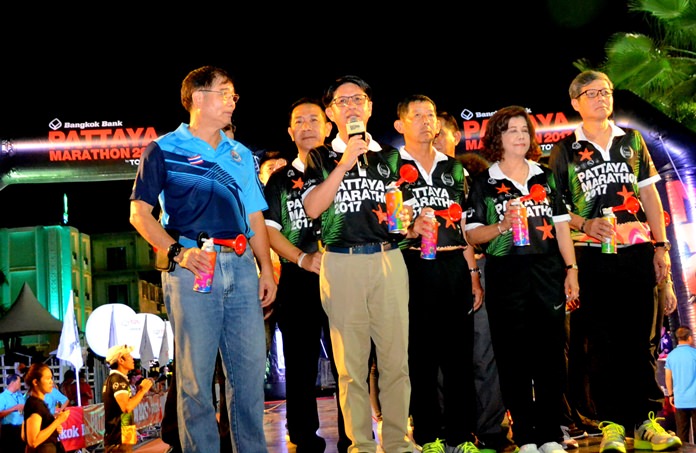 Pattaya mayor Maj. Gen. Anan Charoengchasri and Chonburi governor Pakaratorn Tienchai were among the VIPs on hand at the start line in front of the Central Festival Pattaya Beach shopping mall to send the runners and wheelchair athletes on their way in the early hours of Sunday morning.