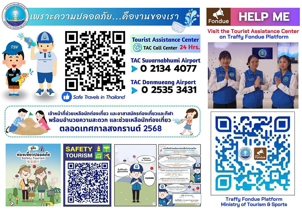 Travel with peace of mind this Songkran! The Tourist Assistance Center (TAC) is here to help you 24/7, with support available in multiple languages and friendly officers stationed nationwide—especially at major airports and Songkran hotspots.