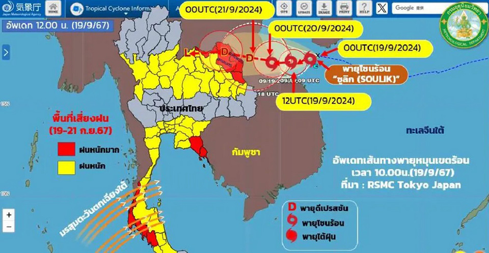 The Thai Meteorological Department (TMD) confirmed that the tropical depression had intensified into Tropical Storm “Soulik” with a central location approximately 90 kilometers northeast of Quang Tri, Vietnam. The storm is moving westward at a speed of about 30 kilometers per hour, with maximum sustained winds near the center reaching 65 kilometers per hour. The TMD predicts that Soulik will make landfall in central Vietnam tonight before gradually weakening as it moves inland.