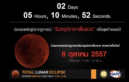 People who wish to observe the lunar eclipse should watch in from an open ground and look toward the East. The event will be broadcast live via www.narit.or.th