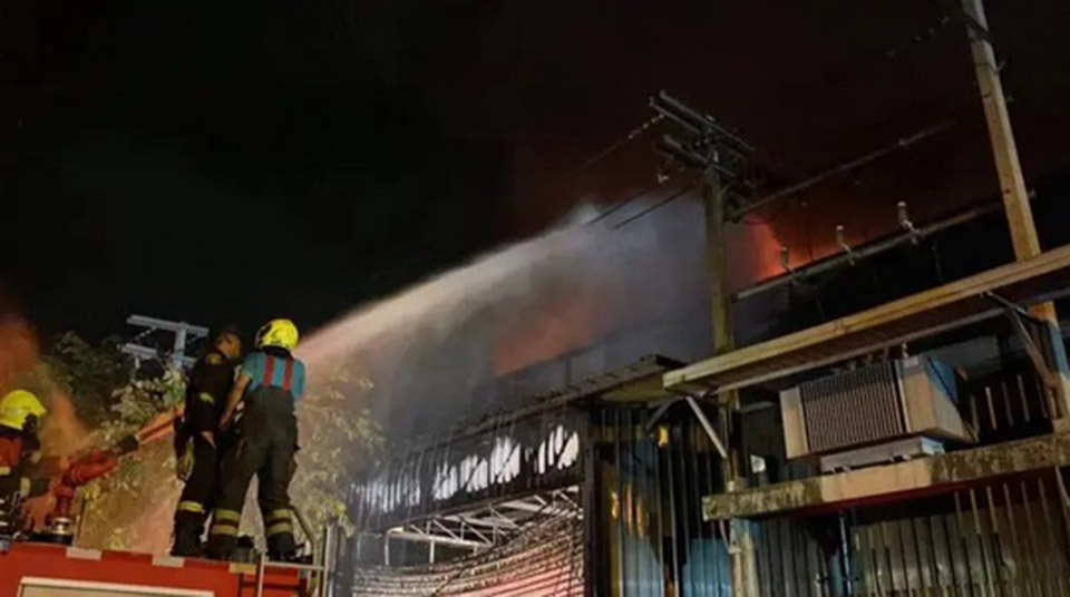 A fire broke out in a private company’s warehouse located in Soi Vibhavadi 22 late last night. The four-storey warehouse contained various types of goods, including some electric bicycle batteries, which are highly flammable, leading to several loud explosions. Part of the building’s rear section was partially damaged.