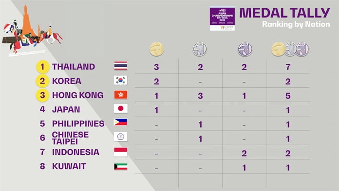 Host country Thailand took 3 Gold, 2 Silver and 2 Bronze from all three disciplines, while Dongheon Nam from Korea took 2 Individual Golds in the dressage competitions. Hong Kong also took home 1 Gold, 3 Silver and 1 Bronze from the Eventing and Show Jumping competitions.