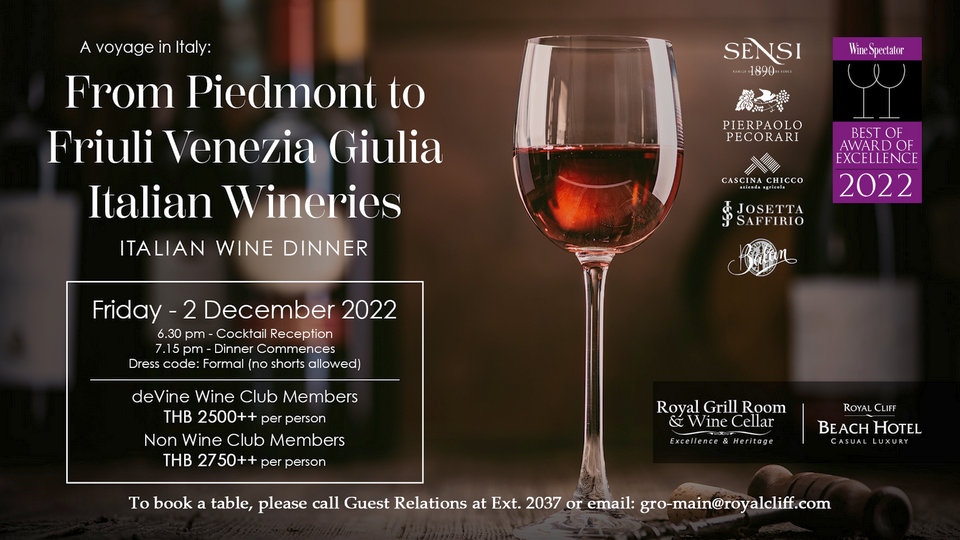 The Royal Cliff is delighted to invite you to their next deVine Club wine dinner, “A Voyage in Italy: From Piedmont to Friuli Venezia Giulia Italian Wineries”, which is due to take place on Friday, 2 December 2022.