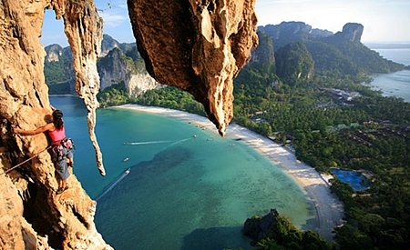 The glamour of climbing at Railay Bay are the surroundings decorated by limestone cliffs, emerald sea water, beaches reaching out to the corners of the sky, and cliffs that are ideal for real cliff hangers.