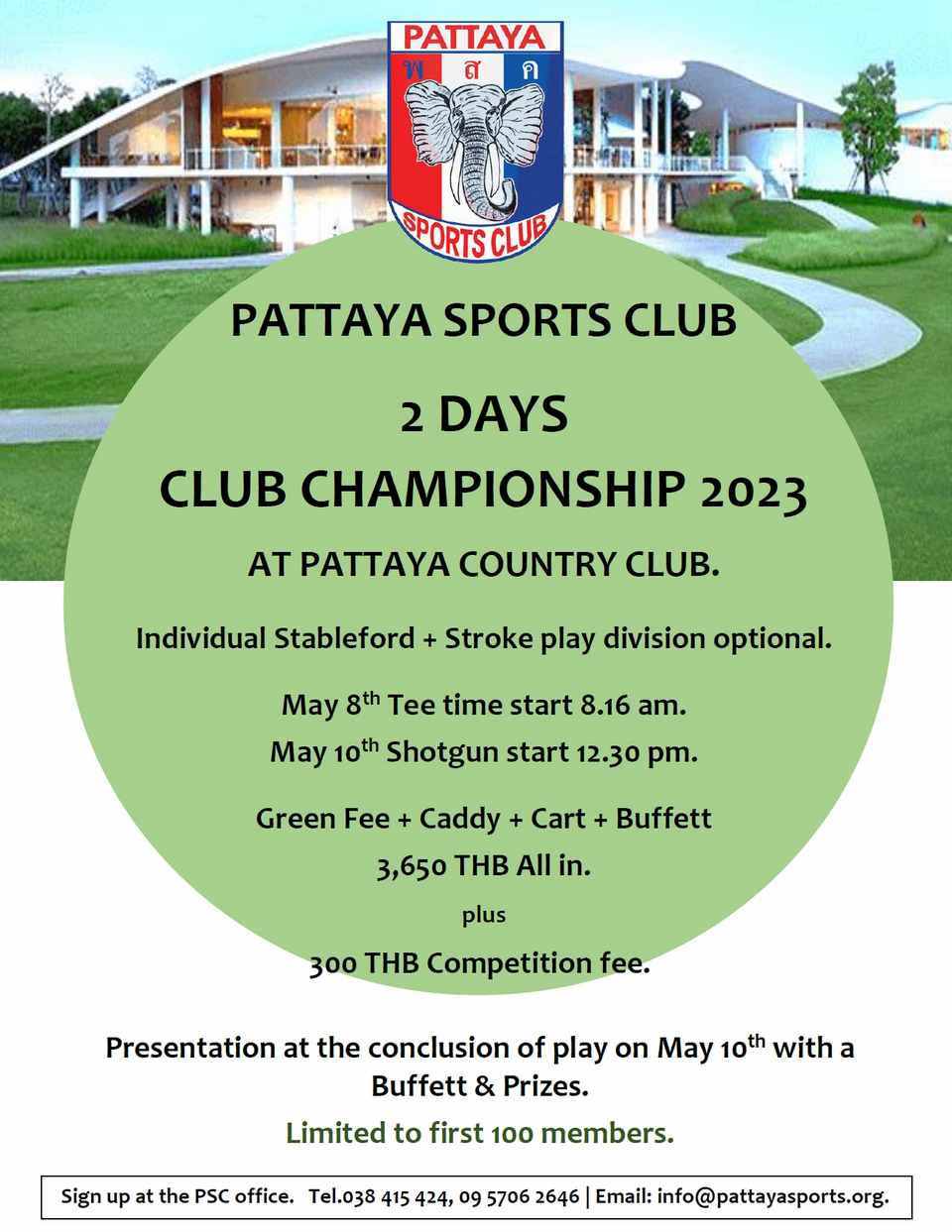 The Pattaya Sport Club would like to announce our golf members Club Championship on May 8 and 10 at the Pattaya Country Club. The format is a two day cumulative event and will have multiple flights with stroke play flights, and stableford flights, all based on handicaps. There will be multiple places in each flight and lucky draw prizes at the conclusion of play on May 10.