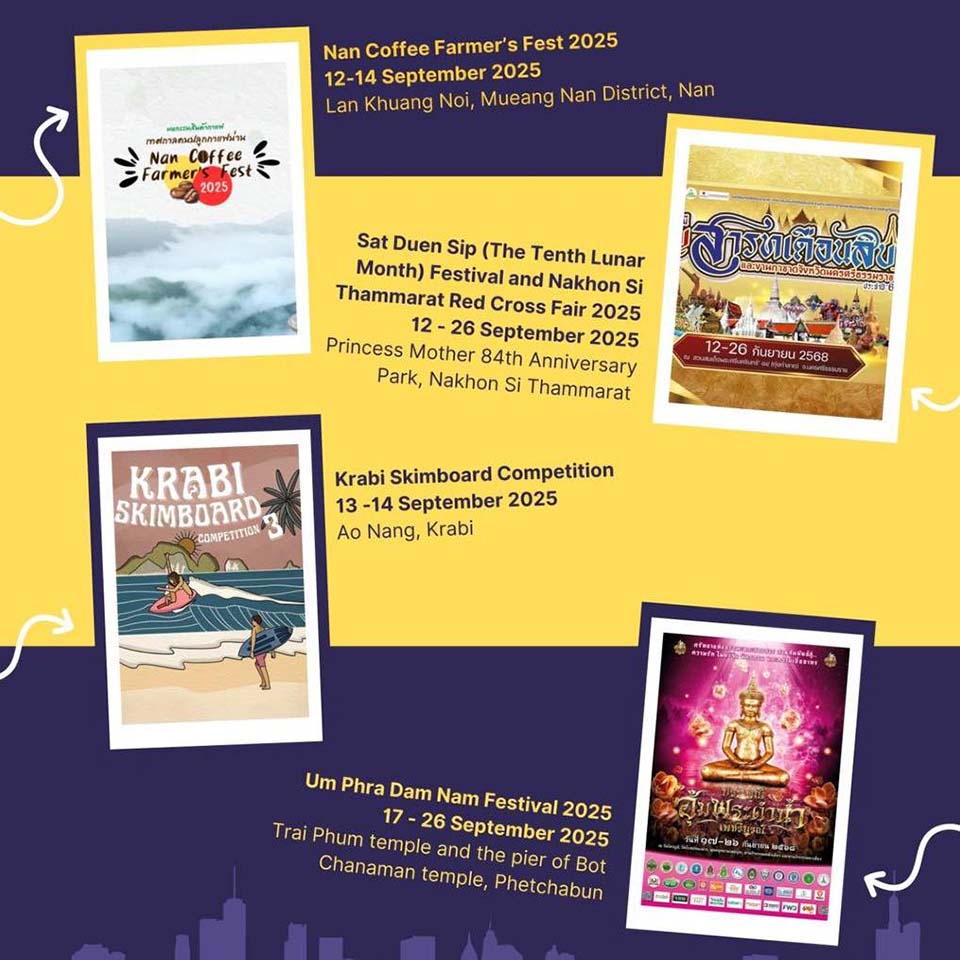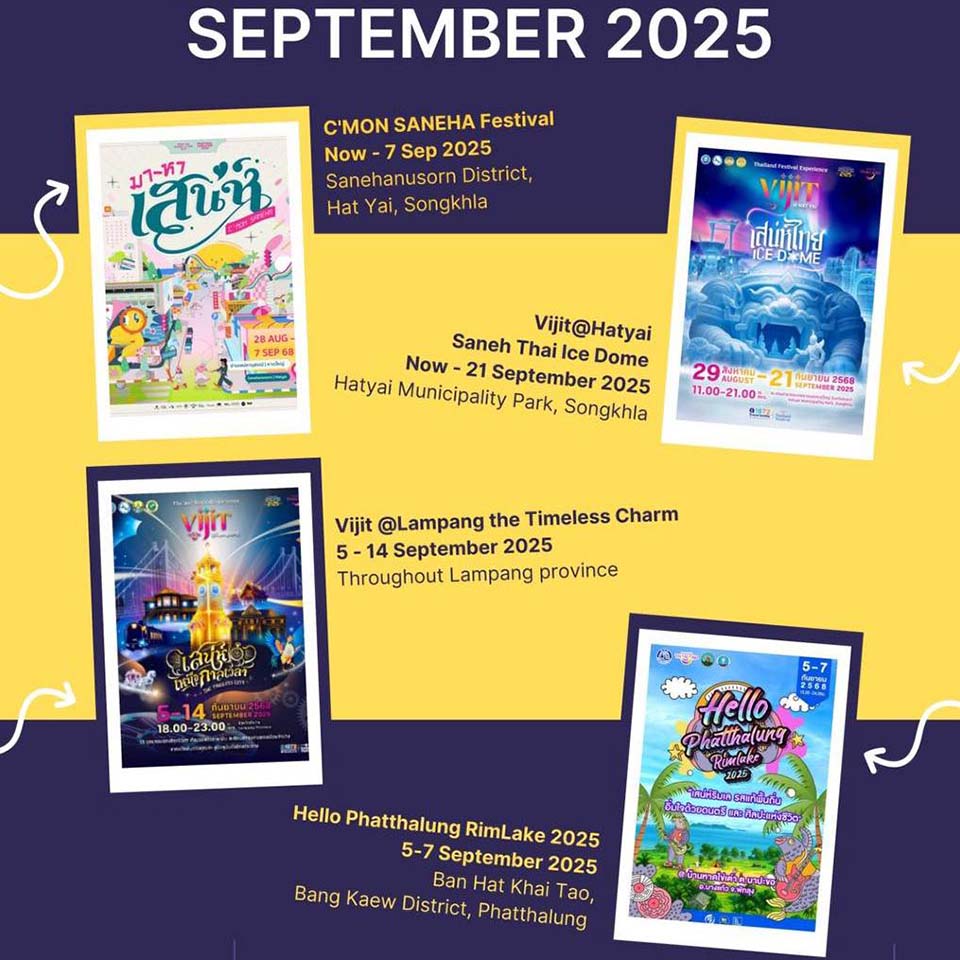 PATTAYA, Thailand – Step into a vibrant September 2025 in Thailand with festivals, sports, and cultural wonders! Feel the rhythm at the C’MON SANEHA Festival and marvel at the icy magic of Vijit@Hatyai Saneh Thai Ice Dome. Experience the lakeside charm at Hello Phatthalung RimLake 2025 and discover tradition at the Akha Swing Festival 2025. Rock out at Rayong Log Jam 2025, sip local flavors at the Nan Coffee Farmer’s Fest 2025, and run along stunning coastlines at the Scenic 1/2 Marathon Krabi 2025. Celebrate heritage at Sat Duen Sip Festival and more. September is set to shine with unforgettable experiences across the country.