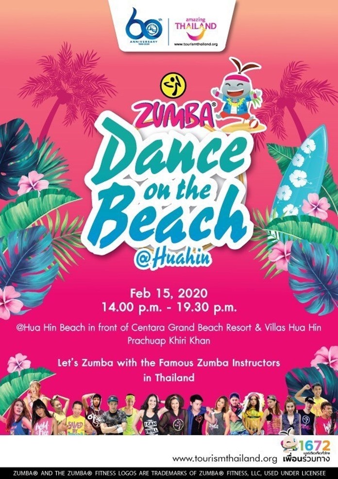 The Tourism Authority of Thailand (TAT) is inviting local and international tourists to dance themselves fit at the “Zumba Dance on the Beach @ Hua Hin” event on 15 February, 2020, from 14.00-19.30 Hrs. at Hua Hin Beach, in front of Centara Grand Beach Resort and Villas Hua Hin, Prachuap Khiri Khan.