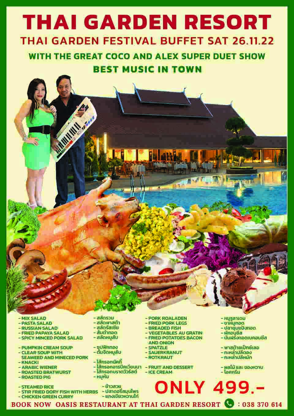 Daily NewsletterWhat's On in Pattaya-ThailandDining & EntertainmentTravel & Tourism Thai Garden Resort Festival Buffet for only THB 499.- By Pattaya Mail November 26, 2022 0 3723 Share on Facebook Tweet on Twitter tweet Thai Garden Resort Festival Buffet for only THB 499.-
