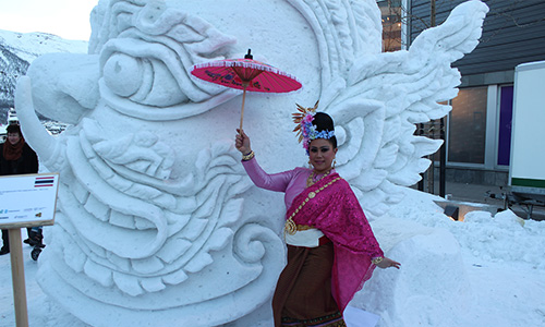 The four-day snow festival was organised by the Thai Tromsø Forening in conjunction with the Royal Thai Embassy in Oslo, the Tourism Authority of Thailand’s (TAT) Stockholm Office, Thai Airways International’s Stockholm Office and The Norwegian Barents Secretariat. This year’s event was a follow up to last year’s well-received “Snow and Ice Sculpture Festival”, held from 15-23 February, 2013, which was organised by the Thai Tromsø Forening to commemorate the close relations between the Kingdoms of Norway and Thailand.