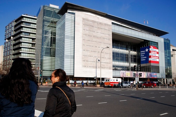 Sitting almost equidistant between the White House and the Capitol on Pennsylvania Avenue, the glass-walled building became instantly recognizable for its multi-story exterior rendition of the First Amendment.
